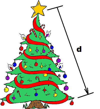 cm (centimeters) or m (meters). Now get a measuring tape and hold one end of it to the pinnacle of your tree. Stretch the tape out to a point on the bottom edge and the note the measurement. It is better to measure this in inches instead of feet. On the right side of the table below, on the line for your last string of lights, type that measurement and select inches, feet, cm or m. The measurement boxes for the other strings of lights will be filled-in automatically for you. For those boxes, you may select inches, feet, cm or m, and the measurements will be updated accordingly. For example, if your tree is 60 inches long and you have 4 strings of lights, 25 feet each, enter 25 and select feet for the first four lines on the left side of the table. Then enter 60 and select inches in the box for the 4th string of lights on the right side of the table. The first three string measurements will be automatically filled-in with 30, 42.43 and 51.96 inches, if you have selected inches for each of these. The numbers tell you where to end each string of lights relative to the pinnacle of the tree. As you are winding lights around the tree, start from the top and try to spread out the lights so when you get to the end of a string of lights you are at the indicated distance from the top of the tree. If you are planning to do this next year with the same tree and lights, get a piece of rope and stretch it from the top of the tree to the bottom and mark the spots where each string of lights should end. Save the rope for next year. But next year don't hold the rope upside down! The marks are more widely spaced toward the top of the tree (for equal length strings of lights). Yeah, you can use this tip even if you don't like the rest of my procedure. You're welcome. |