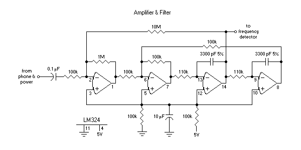 The input to these detectors comes from the phone line, so there is circuitry to protect the unit and the phone system from each other. This doesn’t leave enough for the detectors to work with, so first the strength of the signal is greatly enhanced with an amplifier and filter.