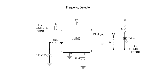 The input is coupled through the 0.1µF capacitor. The output of the LM567 is an uncommitted transistor collector, so is pulled up through the single resistor to 5V so the output is normally 5.0 V. When the frequency is detected, the output is 0.0 V, and the yellow LED lights.