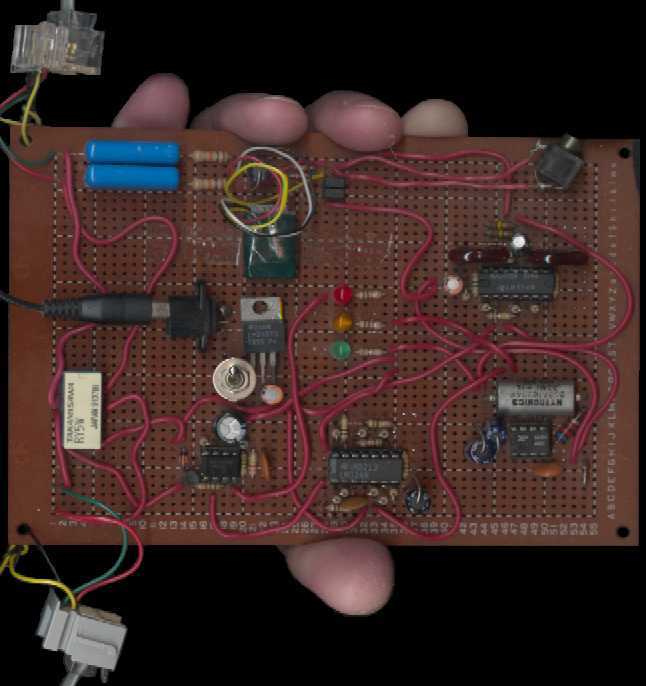 | Photo of a unit built on a PC board: LEDs (center), power input (left), phone jack to wall (upper left), then following the signal path clockwise around the board: phone input, amplifier & filter, frequency detector, pulse detector, timer, phone jack to modem (lower left), and relay. |