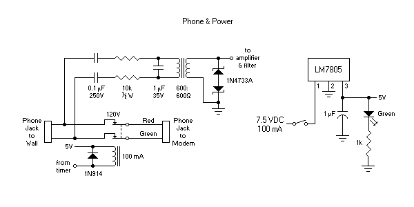 The power supply section includes a bypass capacitor because the unit includes digital circuitry that puts sudden demands on the supply. The green LED lights when power is on.
