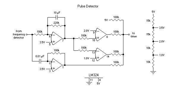The comparators and differentiator outputs combine in a voltage adder at this section’s output. The op-amps are arranged to output at saturation, so have only two output levels, zero and about 3.5 V. So this section’s output is about (3.5 × n + 5.0) / 4, where n is the number of op-amps outputting high. If all op-amps output low, then the section’s output is about 1.25 V; otherwise it is at least 2.125 V. The LM555 in the timer section always triggers when its input is below 1.45 but never when above 1.9 V. So the trigger occurs when three conditions are true simultaneously: the pulse is long enough, the pulse is short enough and the pulse has changed (ended).