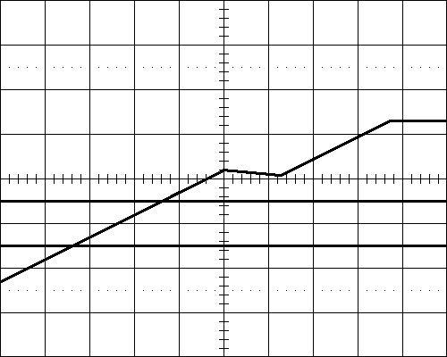 | Oscilloscope image of a troublesome signal as seen at the output of the integrator of the pulse detector of a typical unit. 1V and 2V thresholds are also included. 100 ms/div horizontally, 1 V/div vertically. |